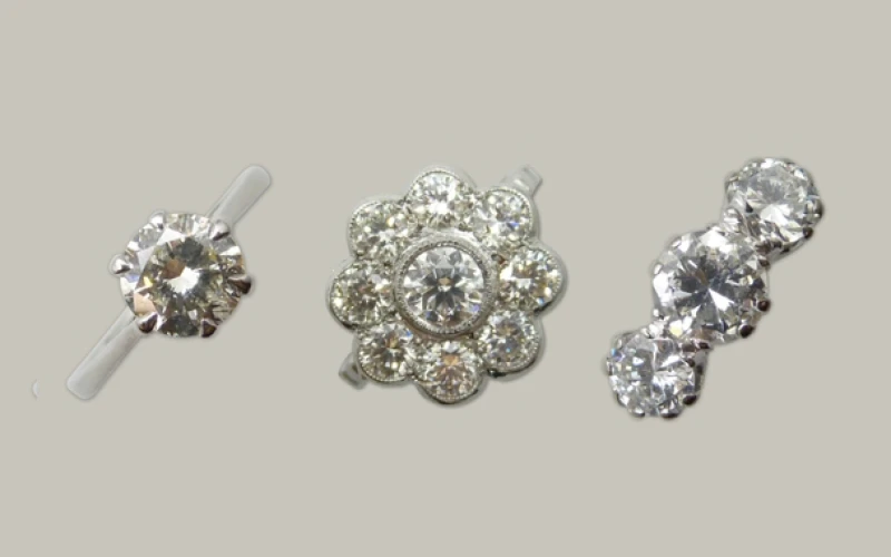 A selection of gold, silver, platinum, and gem-set jewellery featuring exquisite pieces including diamond cluster rings, Art Deco brooches, platinum Tahitian pearl earrings, antique silver vesta cases, designer cufflinks, gemstone pendants, and statement bracelets.