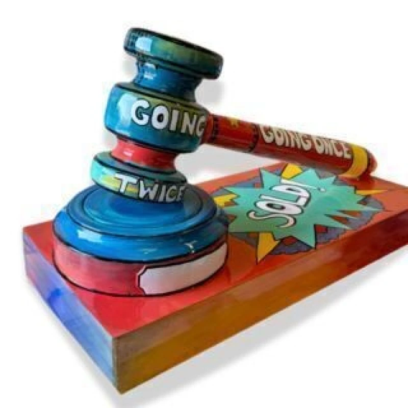 “Going Once, Going Twice… SOLD!” captures the thrill of the auction moment in bold Pop Art style. Bursting with color and comic energy, this hand-painted gavel transforms tradition into playful storytelling and joy.