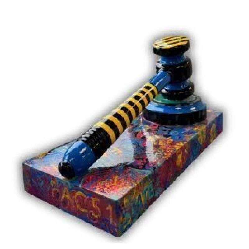 The Work Combines the Formal Symbolism of an Auctioneers Gavel with a Rebellious Pop-Art Twist, Making it Both Humorous and Thought-Provoking. Its Oversized Scale and Vivid Spray-Paint Finish give it an Eye-Catching Presence, Perfect as a Statement Piece for an Office, Gallery or Creative Workspace.