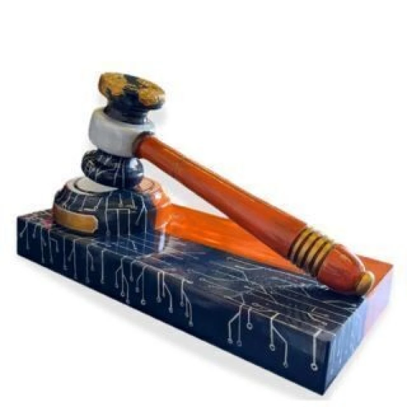With its dynamic palette and mechanical aesthetic, the gavel evokes themes of power, energy, and modern industry. Both sculptural and symbolic, it transforms a traditional auctioneer’s tool into a commanding statement piece of contemporary decorative art.