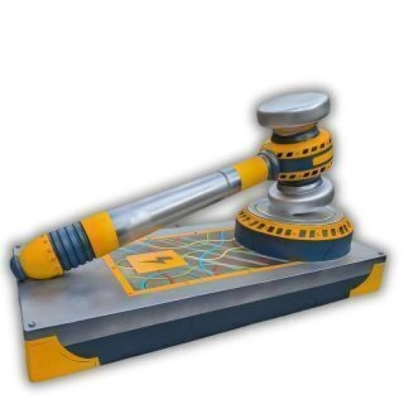 This gavel is reimagined in a bold, futuristic design, rendered in metallic silver, deep grey, and vivid yellow. The piece incorporates industrial motifs, from rivet-like detailing to hazard-striping, alongside a lightning bolt emblem set within an intricate network of coloured lines on the base.