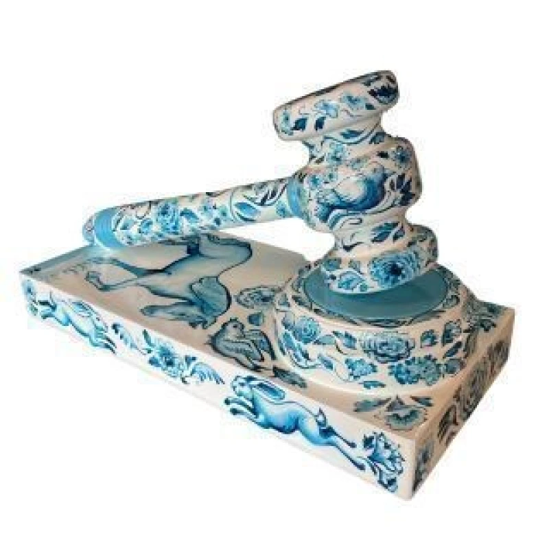 Hand-painted in a Delftware-inspired blue and white palette. The surface of this gavel is richly decorated with intricate floral motifs and folkloric imagery, including hares, horses, and birds. The dynamic design merges traditional decorative art with contemporary expression, elevating a familiar object into a striking work of art.
