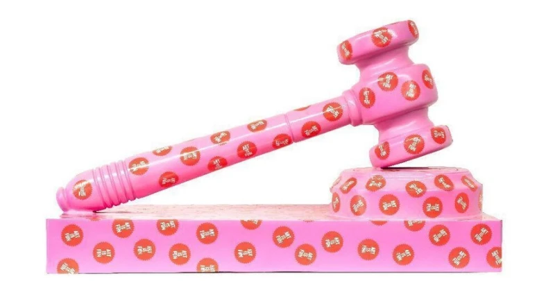A giant gavel, resin with pink spray paint and applied stickers.