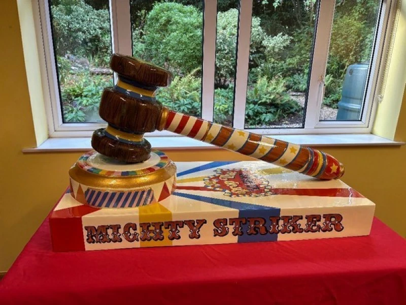 This gavel is transformed into a playful spectacle of colour and pattern, inspired by the visual language of vintage fairgrounds and circus attractions. Bold stripes, stars, and gold detailing adorn the handle and head, while the base is styled like a traditional strength tester, emblazoned with the words “Mighty Striker.”