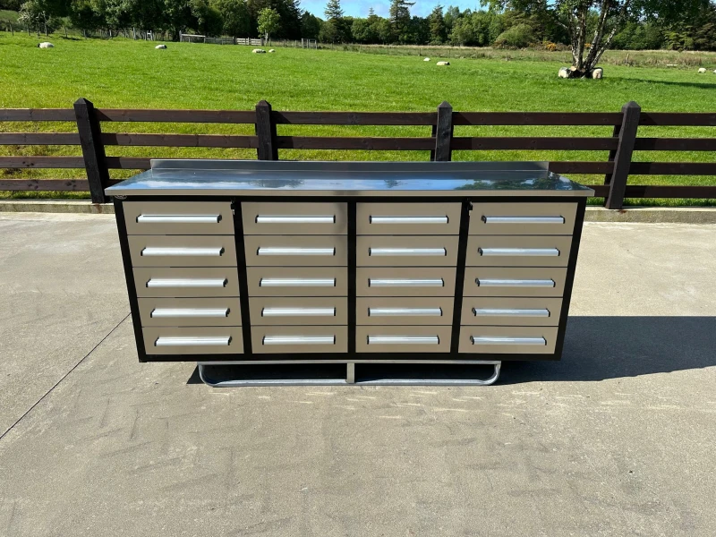 - Unused stainless steel 7ft workbenches with multiple drawers