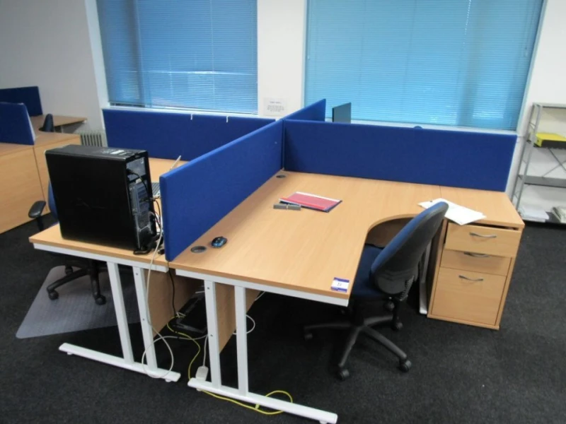 - 4 beech effect desk cluster including 4 chairs, 4 pedestals and privacy screens