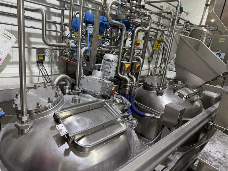 - Cooking system. Comprising 2 x 1 ton capacity jacketed cooking vessels. All s/s with side wall scrape. With steam injection. 1 x 500 litre liquidverter. With all pumps and valves.