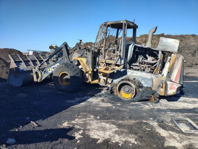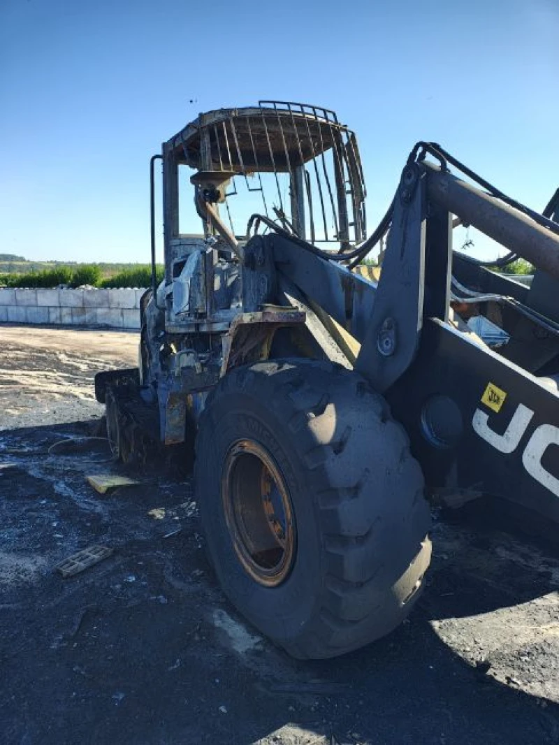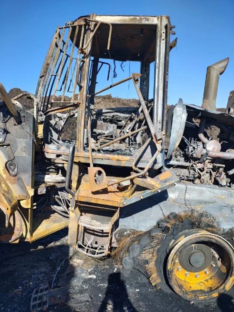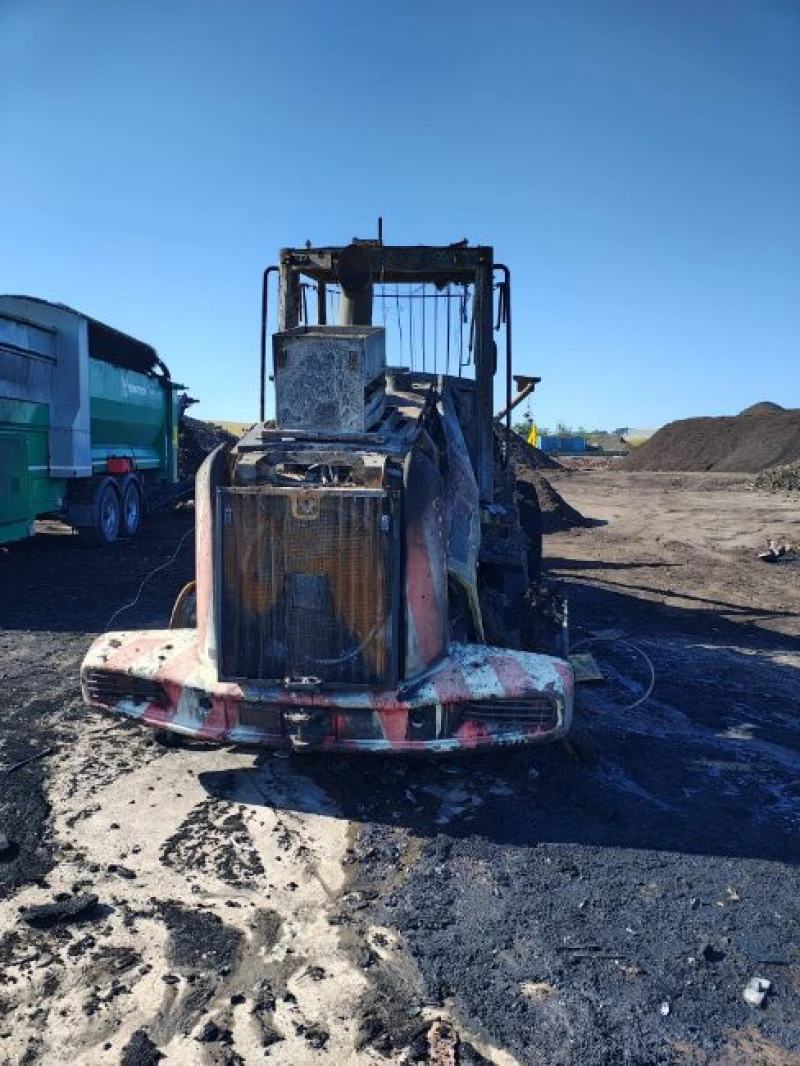 Fire damage is primarily around the engine and operator's cabin, three of the four tyres had burst in the fire. The steel panels of the engine compartment had deformed above the wheels. The near-side panel had detached from the engine cover. Fuel Filler nozzle had ruptured and partially detached from the tank. The majority of the aluminium and low-melting-point alloys of the engine had melted in the fire including the alternator housing, the starter motor mounts, and the gearbox casing.