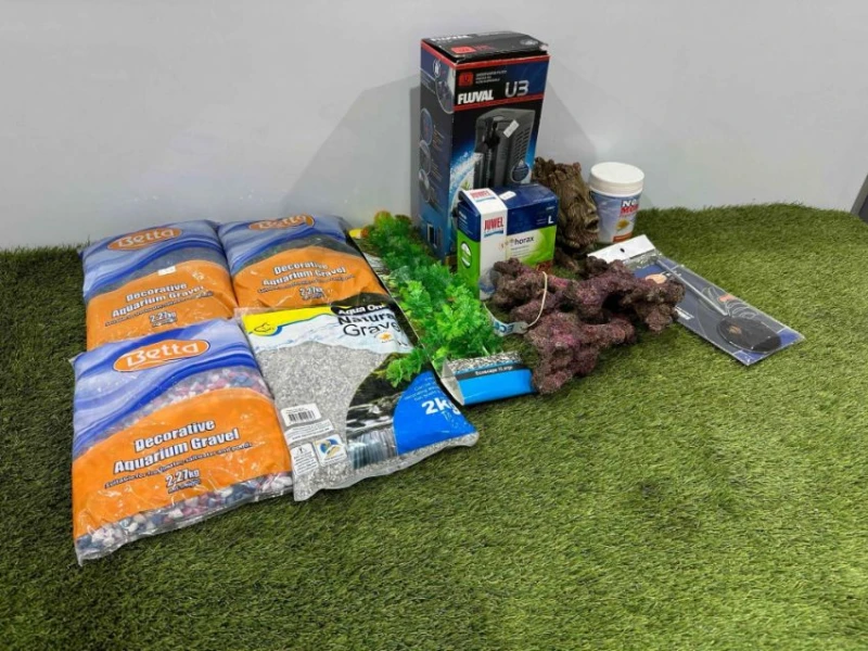 - Aquarium Set Comprising; Aquarium Gravel, Decorative Items, Fish Nets, Bio Starter, Ammo Stop & …