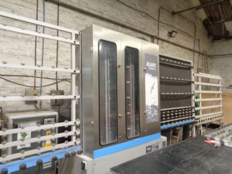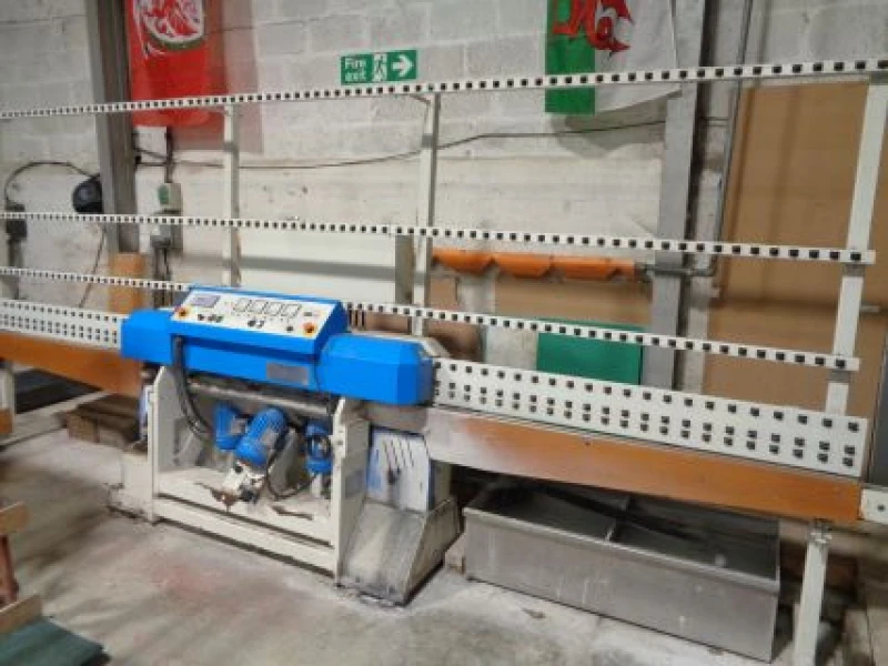 This auction includes glass cutting, edging and grinding machinery, hot melt equipment, a pass-through glass washer, compressors and supporting factory/office items, located at Fforest-Fach, Swansea. Highlights include: