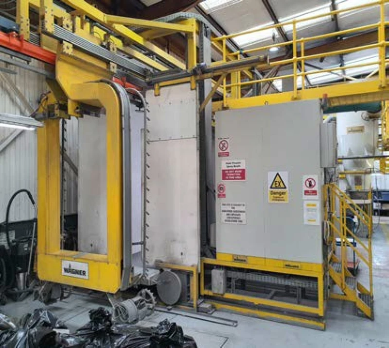 Wagner paint powder spray booth, through feed, Gema Optiflex A2 twin 5 head paint gun system, Gema Opticentre paint powder station (2017), Wagner paint plant reclaim / extraction system
