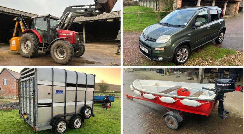 Tractor: 2003 Massey Ferguson 4345 4WD (2558 hours) c/w Quicke F/E Loader & Bale Spike Sleeves; Vehicles: 2013 Fiat Panda 4WD Car; Farm Machinery: 2024 McConnel PA5155 Hedgetrimmer; 2008 Major 800SM Pasture Topper; Haybob 300; LSM M6 Pasture Topper; 2007 Hakki Pilke Eagle Log Processor; Browns Hydraulic Log Splitter; Attachments: Bale Squeeze; 5' Dung Grab; 6' Loader Bucket; 3pnt Linkage Bale Spike; Trailers: Ifor Williams: 10' Livestock Trailer, 8' X 4' Plant Trailer; Marston D6.5 Tipping Trailer; Bowser Tank And Trailer; Livestock Equip: SGB Agriculture Foot Trimming Crush; 3 x 6' Galvanised Sheep Hurdles; Sheep Husbandry Chair/Sling; Rheintechnik 2020 HK Carving Aid; 2 Galvanised Hay Racks; 7' Plastic Ground Feed Trough; 2 x 3' Ground Feed Troughs; 3' Galvanised Feed Trough; JFC: 4' Plastic Water Trough, 2 Hotline P500 Fencers; Mixed Fencing Stakes; Animal Husbandry/Show Items; Liveryman: 240v Clippers, Cordless Detail Clippers; Warrie Shearing Sling; Wolseley Shearing Unit; Shearing Stand/Show Prep Stand; Stock & Poultry Wire; 12' Field Gate; 2 Metal Gates; David Thomas Post Banger; Building: Qty Of Mixed Timber, Ironmongery; Sand, Cement, Lime; 5 Oak Planks; Various Mesh Lengths; Assorted Water Fittings; Hosepipe, Drain Pipe Etc; Fencing Materials & Equipment: 47 x 5'6'' Wooden Fence Stakes; 5 x 7' Wooden Fence Posts; 14 x 12' Wooden Half Rails; Mixed Square And Round Posts; 54 x 4' Pigtail Stakes; Ass Equip: 1300L Oil Tank; Aluminium Loft Ladder & Step Ladder; 6M Length of New Chain; Mig Mate Super Welder; Metal Guillotine; Part Full Oil Drums; Tow Chain; Metal Framed Workbenche & Vice; 4 Bays Of Workshop Racking; Garden: 4' Garden Roller And Aerator; 4' Trough/Planter; 2 Belfast Sink Planters; MIS: Slippery Devil Boat & Transport Trailer; Vintage Fire Extinguisher; 3 Camping Cooking Sets; Vintage Lamps, Lanterns; Vintage Wooden Barrel; Home-Made Spit Roaster; Hessian Sacks; Hessian Matting; Sausage Making Equipment; 6 Thermal Storage Boxes; Vigo Apple Press & Associated Equipment; Fodder: 78 Conventional Bales of Barley Straw