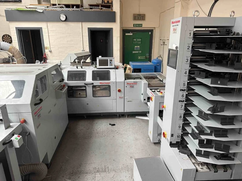 Online auction offering a selection of quality print, finishing, and workshop equipment, including stitching, cutting, laminating, drilling, and binding machinery, wide-format and digital printers, compressors, a forklift, racking, workbenches, media storage, office equipment and more to include -