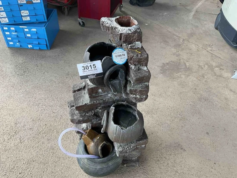 Monthly Collective Auction of Trade & Retail Stocks featuring a diverse mix of homeware, furniture, garden décor, fire pits, chimineas, water features, artificial plants, and retail clearance items from multiple vendors.