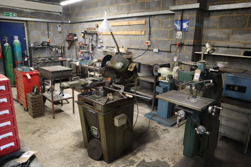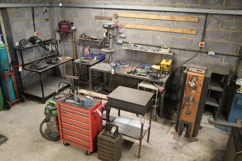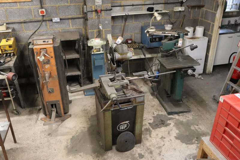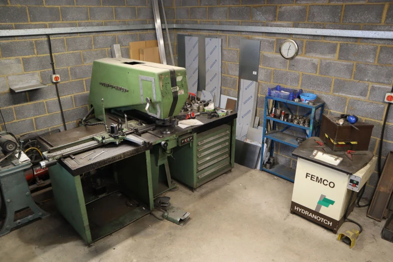 Adira GHO-0425 sheet metal guillotine with powered backstop, year 1989; Pierce-All Perf-o-Mator punch press with a range of tooling; Femco Hydranotch corner notcher; Guifil PE-30 hydraulic 30 ton press brake, Maq PE20/30, Year 1983; Fobco pillar drill; Thermal Arc 175TE tig welder; Draper GD16/16C single phase bench drill; Studfast CDM8 stud welder; Meritus RFS 20A stud welder, Suhner flexible drive grinder; Oxy Acetylene welding gear; Vanco 2 inch vertical linisher; Pedrazzoli MEC Brown 75 metal cut off saw; Opti PSM 250double ended polishing spindle; Norton number 6DB flypress