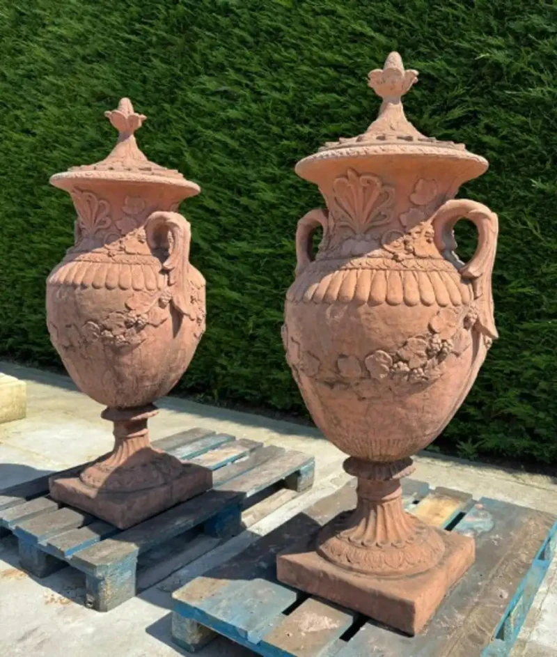 - Matching Pair Classical Stone Composite 5ft Tall Ornate Urns with Handles and Lid – Antique Terracotta Finish