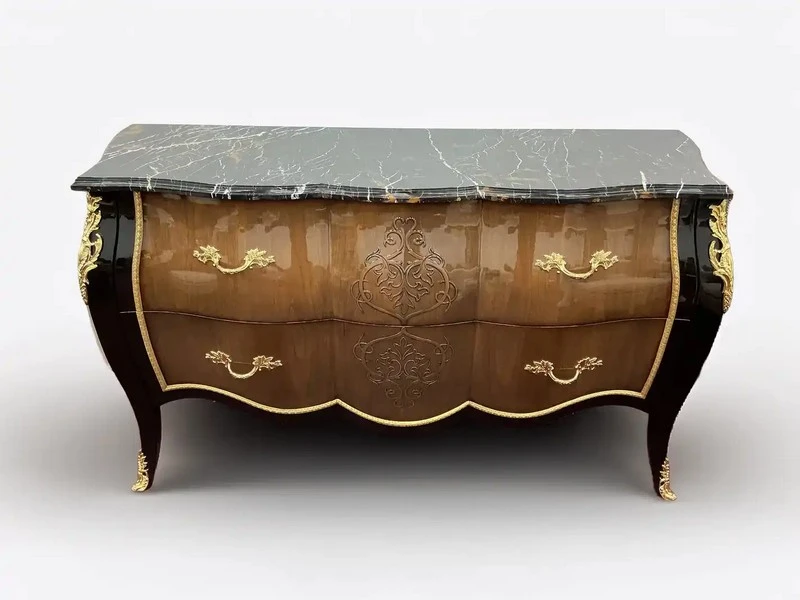 - Heritage luxury chest of drawers with gold leaf, marble top and polished wood veneer