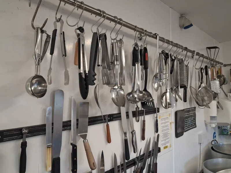 - Large Selection of Utensils Hanging on Wall: Whisks, Knives & Spoons