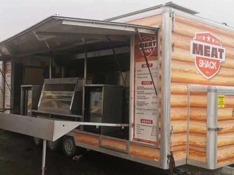 - 22 x 8 Butler Triple Axle Catering Trailer Fold Out Canopy, 2 x Friers, Potato Chipper, Under Counter Fridge, Stainless Steel Sink, 2 x Display Drinks Fridges & Passthrough Hot Cabinet